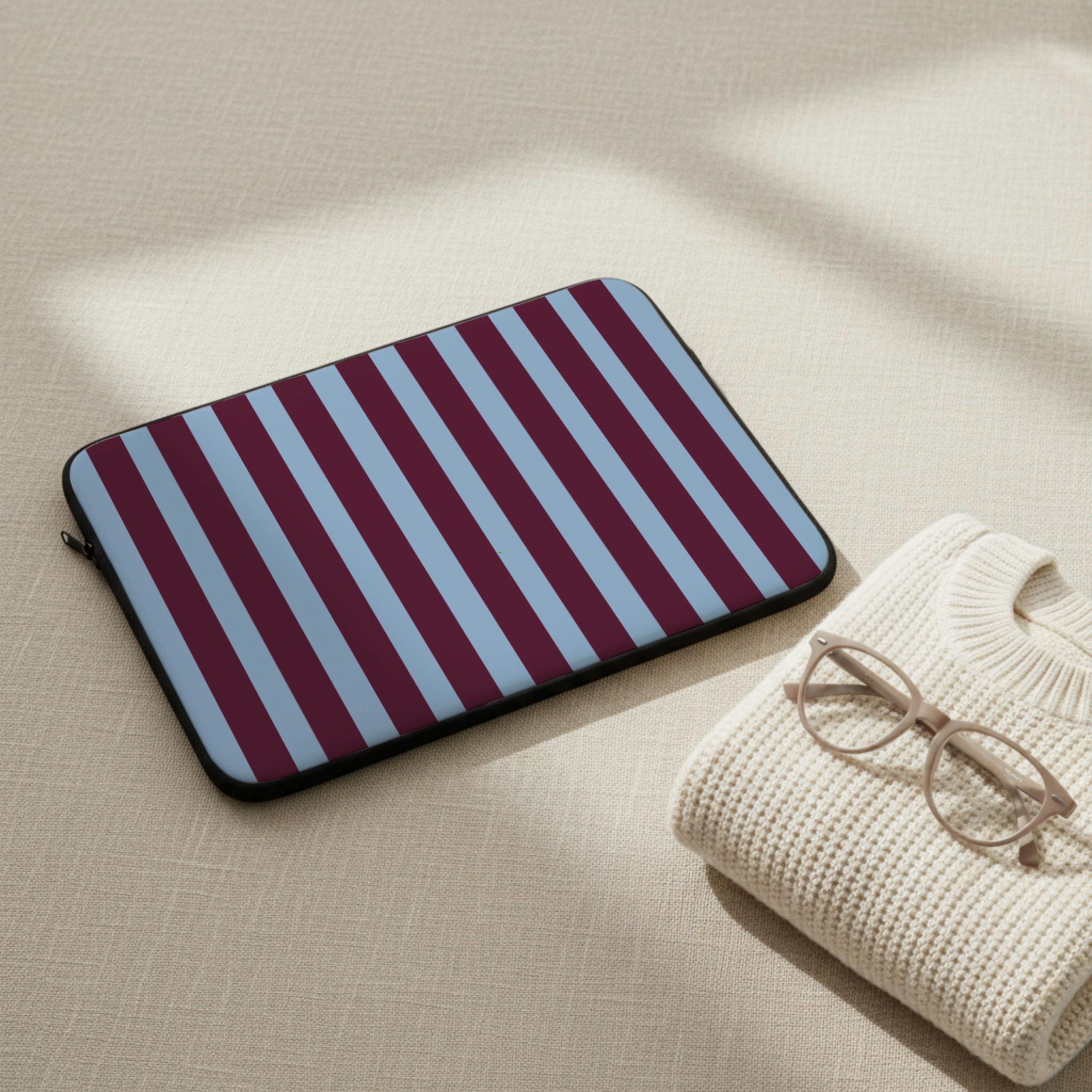 Minimalist laptop sleeve with a calm vertical stripe design, made to protect your device without adding bulk. Cushioned interior helps guard against everyday bumps and dust, with a smooth zipper for easy access. Fits neatly into backpacks and tote bags.